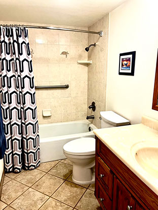 - Bathroom shower over tub with beautiful tile surround.